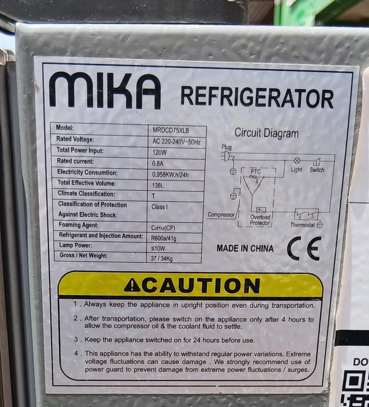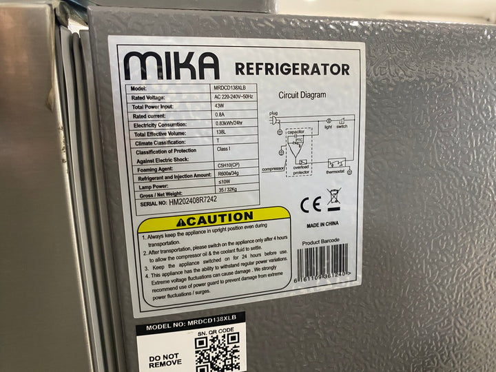 Brand: MIKA Model: MRDCD138XLB(MRDCD75XLB) Type: Top Mount Freezer, Defrost Fridge Capacity: 138L Color: Black