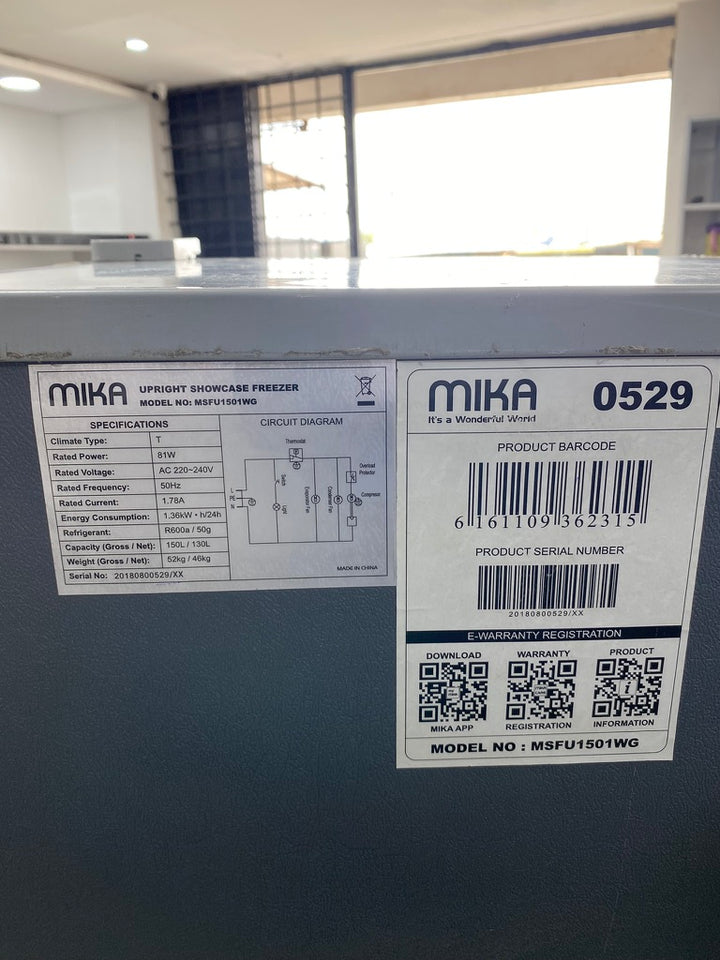 Brand: MIKA Model: MSFU1501WG Type: Upright Showcase Chiller Capacity: 150L Color: White